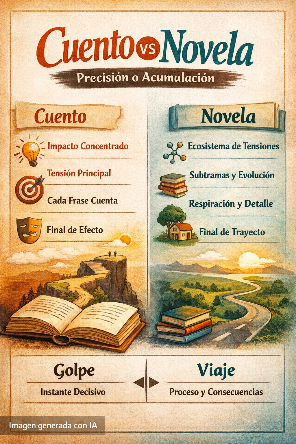 Resumen: el cuento se construye como un mecanismo de precisión: todo empuja hacia un efecto. La novela se construye como una vida en movimiento: el sentido aparece por acumulación, evolución y consecuencias.