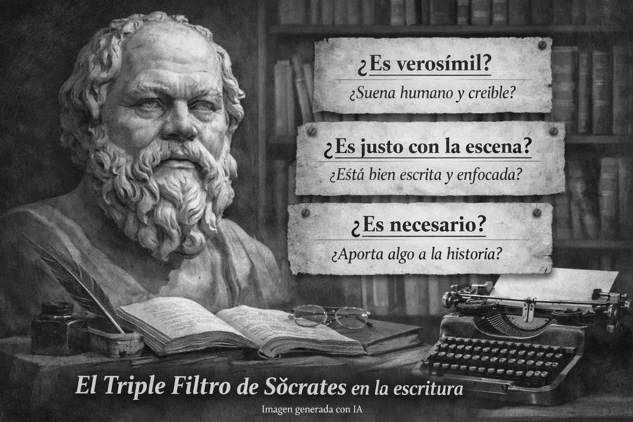 Cuando termines, vuelve a formular el triple filtro con lenguaje de taller: ¿es verosímil?, ¿es justo con la escena?, ¿es necesario? Esa versión convierte una anécdota filosófica en una herramienta práctica para podar, afinar y fortalecer un manuscrito.